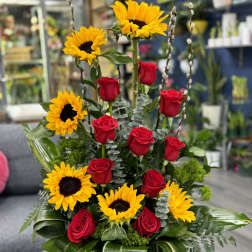Price: $165.95Sunny Love” Tall Arrangement – Roses & Sunflowers